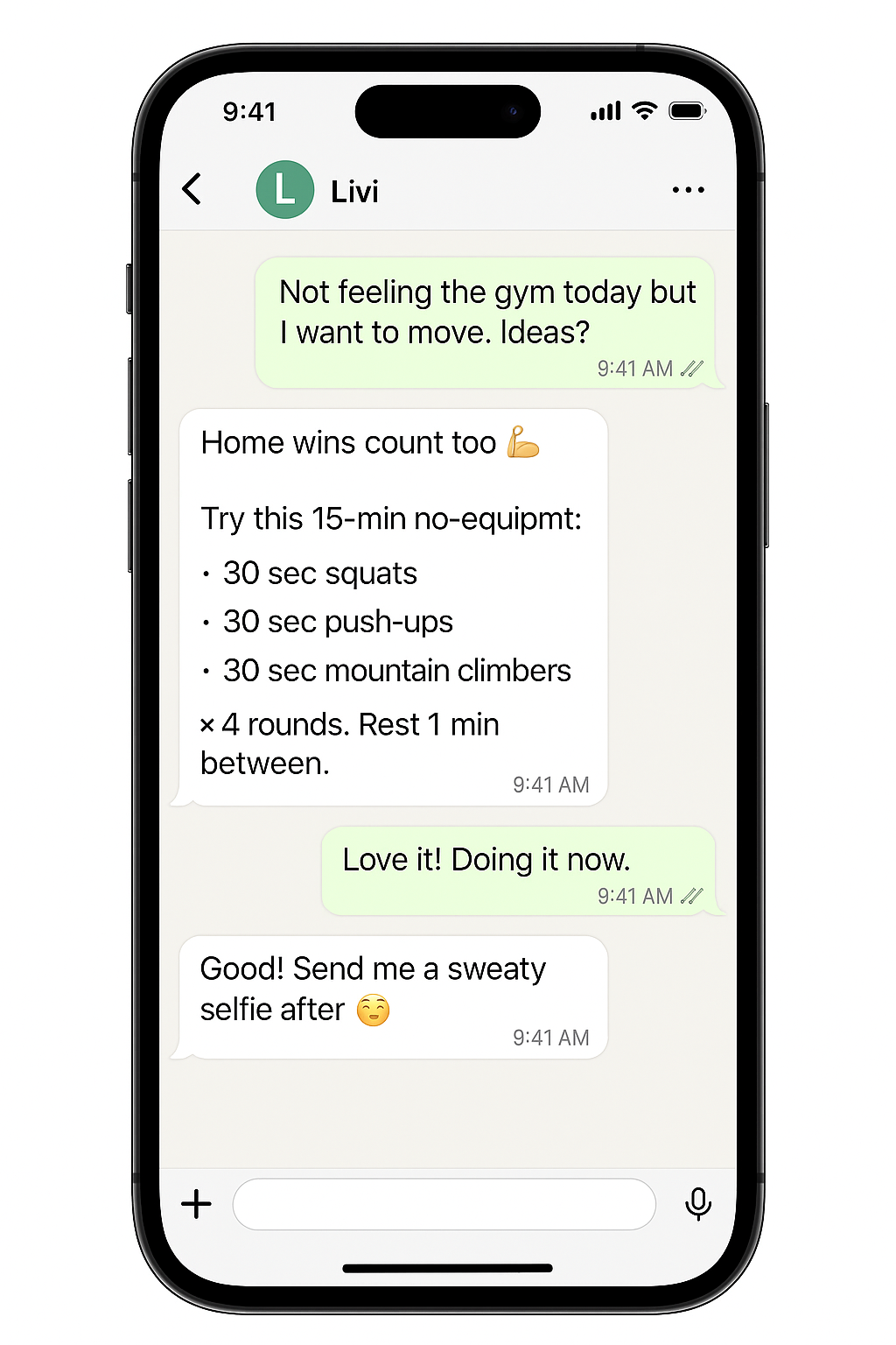 Skip the gym excuses - tell Livi your mood, space, and energy level, and she delivers a custom workout with or without equipment, clear timers, and fun encouragement to get you moving and sweating right where you are.