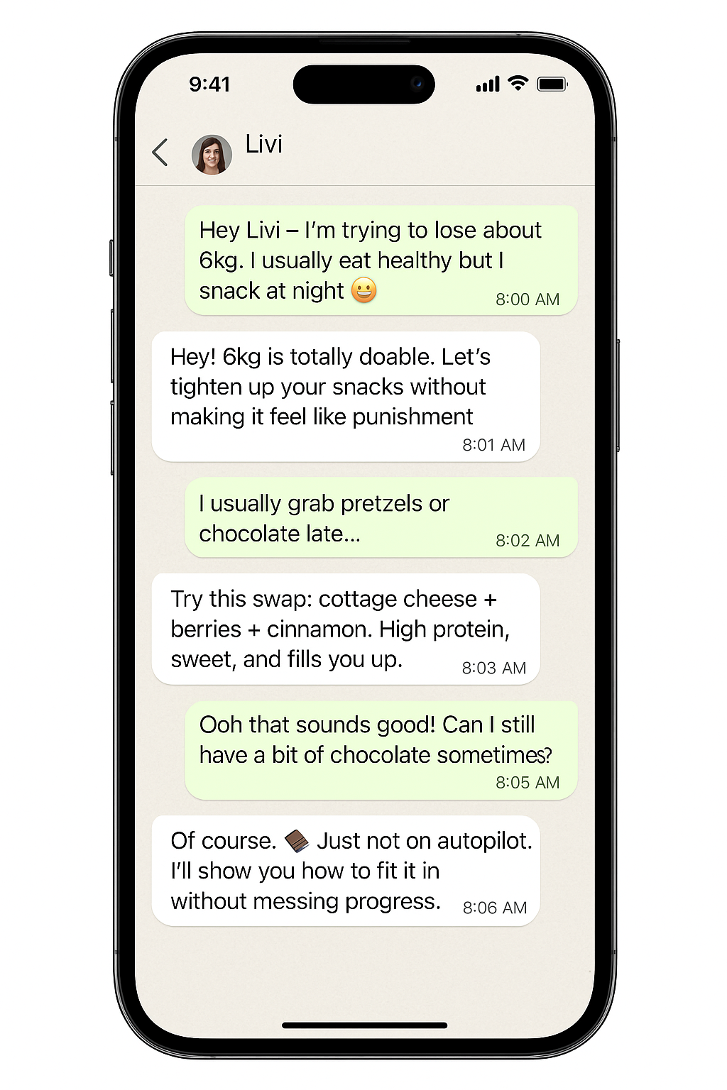 Livi is your personal dietitian in your pocket - real, relatable, and results-driven. She helps you lose weight with tailored meal advice, instant feedback on your food pics, realistic fitness tips, and a warm, no-judgment chat that feels more like texting a smart best friend than following a strict plan.