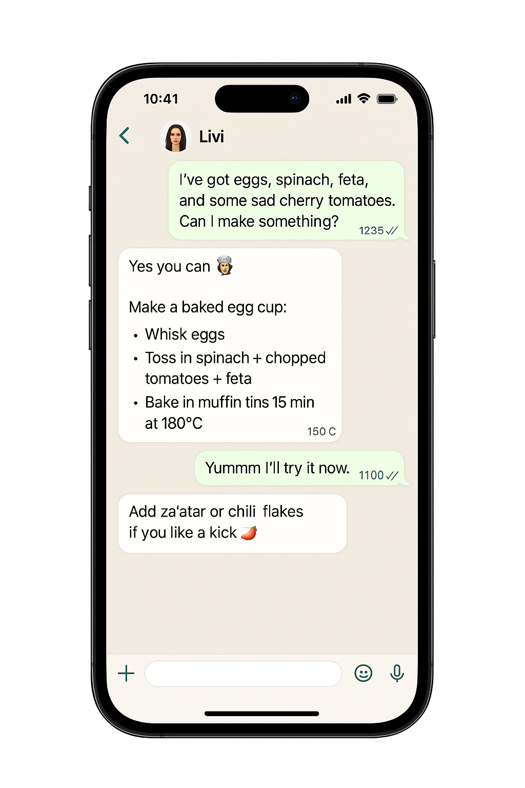 Share what’s in your kitchen, or what fits your taste buds, and Livi whips up mouthwatering, nutrition-packed recipes in seconds - simple steps, bold flavors, and zero guilt, so you eat better without sacrificing the joy of delicious food.